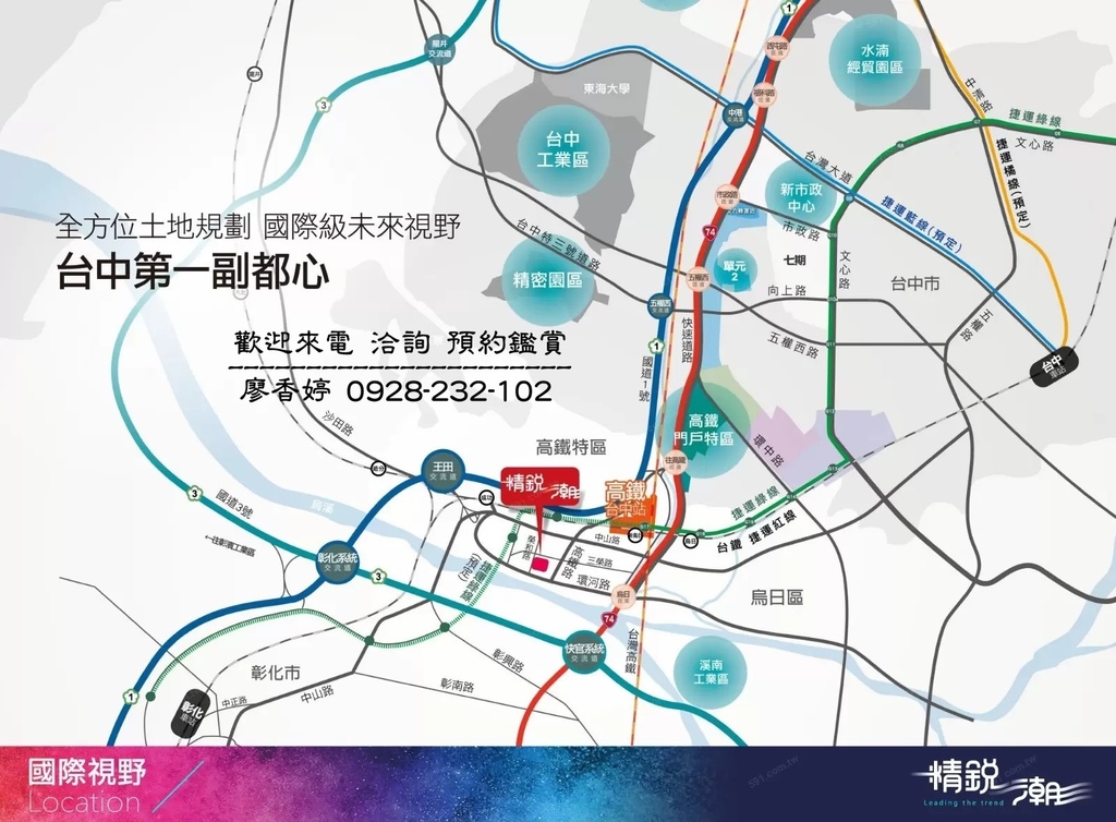 ◆ 【精銳潮】「精銳 潮」由精銳品牌旗下的悅築建設投資興建,基地位於烏日區榮和路與三榮路口,面積約1390坪,規劃地上12層、地下2層,有2房26坪、3房32~40坪四種房型,共兩棟,132戶住家。 ◆ 【精銳潮】台中副都心,中台灣唯一三鐵共構區塊,九條通路網串起高鐵特區,千億建設領動趨勢巨潮,一線建商跟進倍增高鐵特區看好度,潮 得勢不可擋。