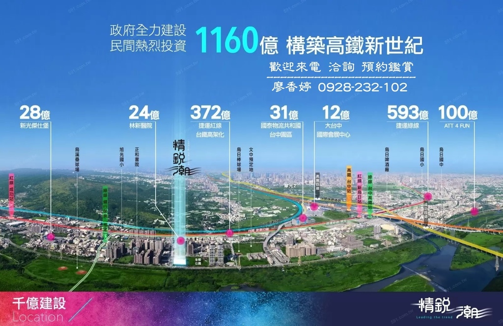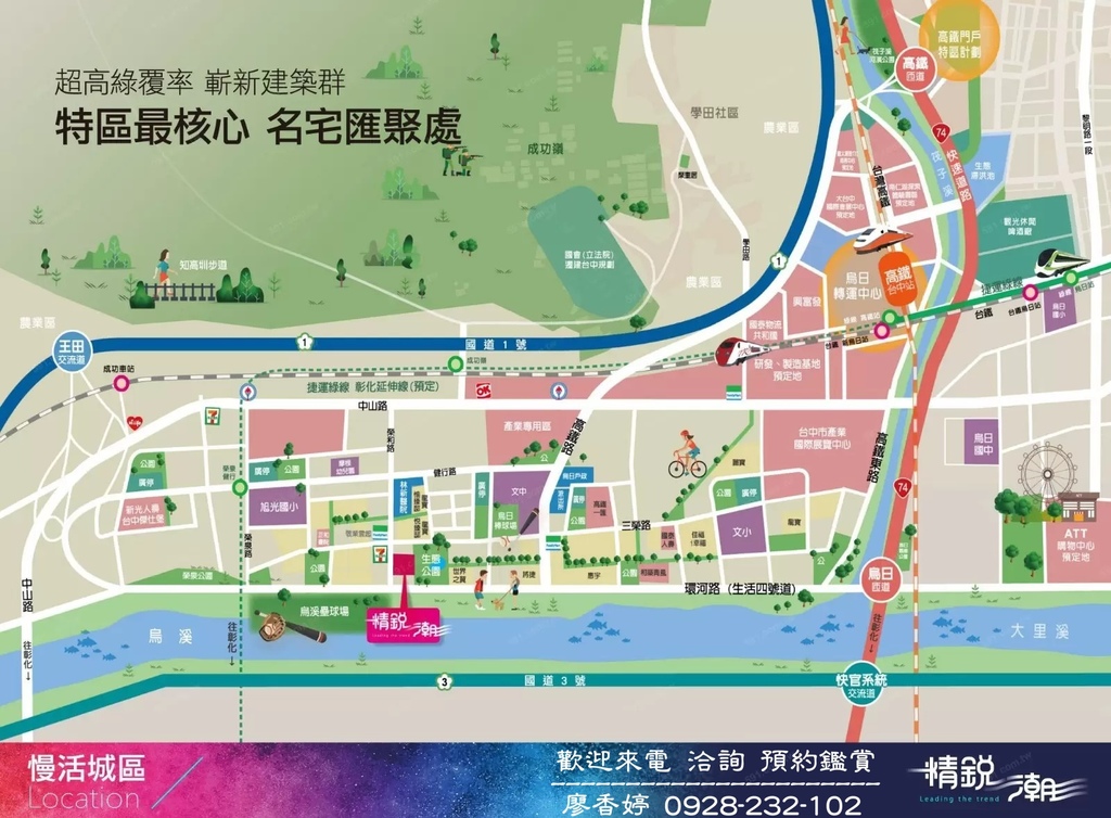 ◆ 【精銳潮】精銳潮 位於特區最核心,13座公園綠地串聯,書寫特區森活風貌。 ◆ 【精銳潮】特區機能逐漸成熟,路口便利商店滿足生活便利性,旭光國小走路接送6分鐘,烏日商圈5分鐘車程採買方便,台中高鐵站6分鐘車程,捷運綠線即將通車,中彰快速道路、中山高速公路均可5分鐘內上交流道,南來北往交通便利。